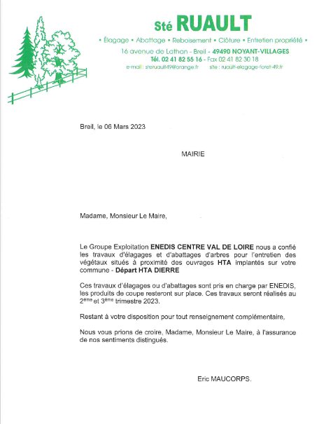 Enedis vous informe des travaux d'abattages et d'élagages qui seront effectués sur votre commune 1er semestre 2023 par la société RUAULT