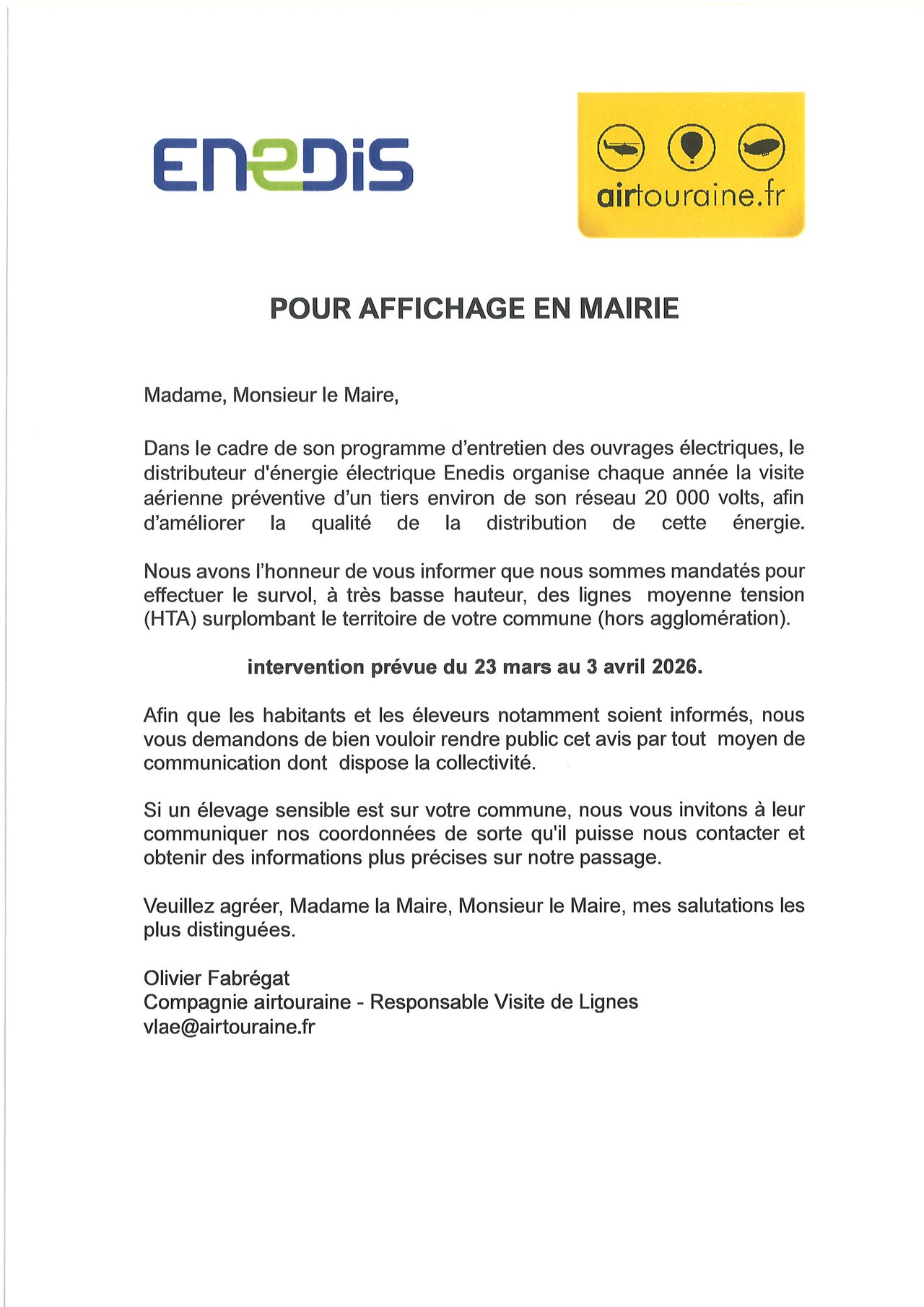 Avis de visite aérienne préventive programmée par ENEDIS dans le cadre de son programme d'entretien des ouvrages électriques.